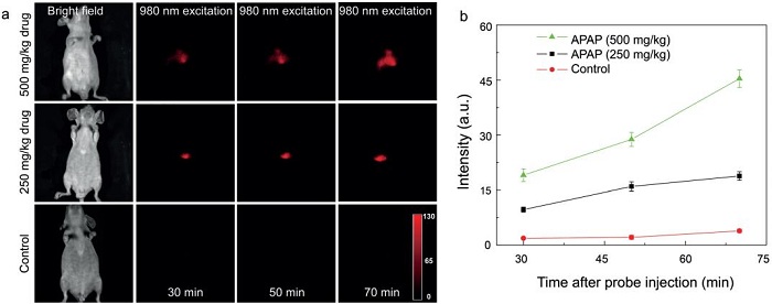 药物诱导的肝损伤是现代医疗的一大难题。扑热息痛(APAP)是一种常用的抗痛/抗高烧的药物,但是当APAP过量使用时由于产生活性氮(RNS)而会导致严重的肝毒性。ONOO–是RNS中的一种,可以作为肝毒性的生物标记物。但是ONOO–的寿命很短,在体内监控它们很困难。