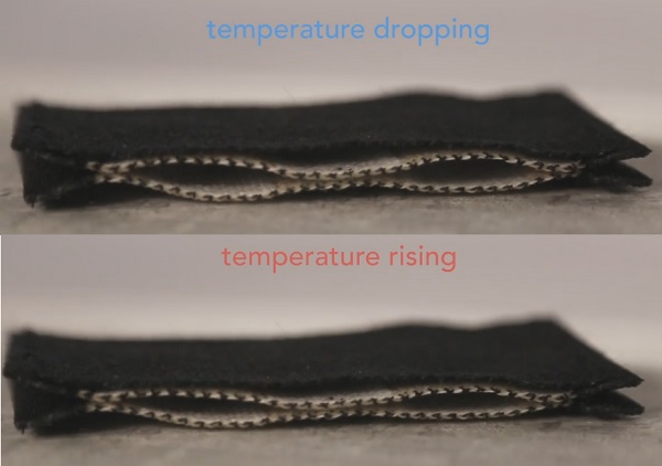 该织物可能需要一分钟左右的时间才能从完全平坦化转变为弯曲状态,然后再回到一分钟前的状态,但是这已经很迅速而且足够被拿来应用。在最低的状态,织物像一件沉重的T恤;在最好的状态,它像是配备大型户外装备,在15℃的温度下降时,它的绝缘能力提高了三倍。