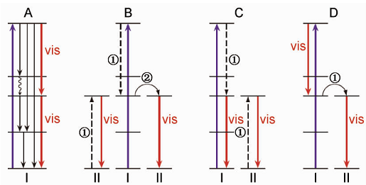 下转换发光是指遵循斯托克斯定律的光致发光现象,即发射的光子能量低于吸收的光子能量,材料的发射光谱位于激发光谱的长波边 也就是说,材料吸收高能短波辐射,发射低能长波辐射。实现下转换发光有以下两种转换途径: