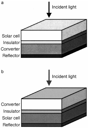 上转换模型中,转换层位于太阳能电池的底部与太阳能电池相互独立,反射层在上转换层的下面,能将未被太阳能电池吸收的光子重新吸收,然后通过两个或两个以上连续跃迁产生电子-空穴对。电子-空穴对再通过辐射带带间跃迁进行复合,随后发射出能量与能带隙相匹配的光子。上转换模型的优点为:(1)对上转换发光已具备足够的研究基础;(2)上转换层可置于太阳能电池的底部,不会影响太阳能电池对能量高于Eg的光子的吸收;(3)反射层的引入避免了光逃逸。但上转换需要很大的入射功率,原因是上转换是一个非线性光学过程。最适合用上转换来提高效率的太阳能电池有染料敏化太阳能电池、非晶硅太阳能电池等。