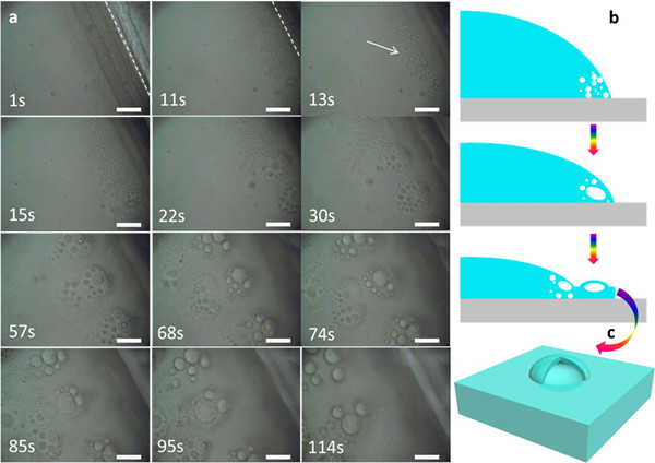 (b)CQD/PMMA纳米复合物液滴在干燥过程中形成微泡的示意图