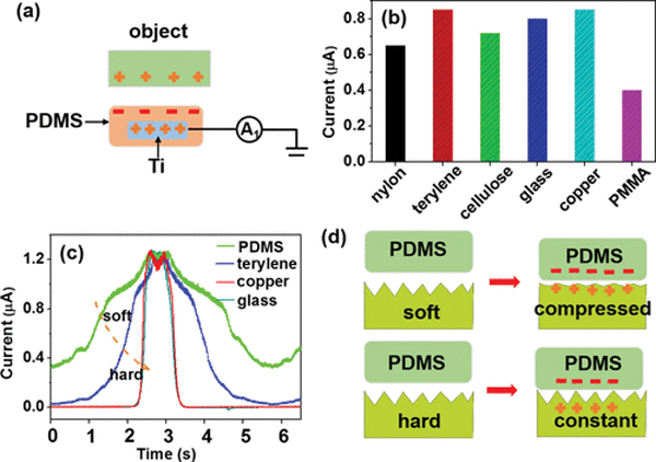 b) 在不同材料接触压力下大约100 Pa,智能触觉传感器输出电流的测试;