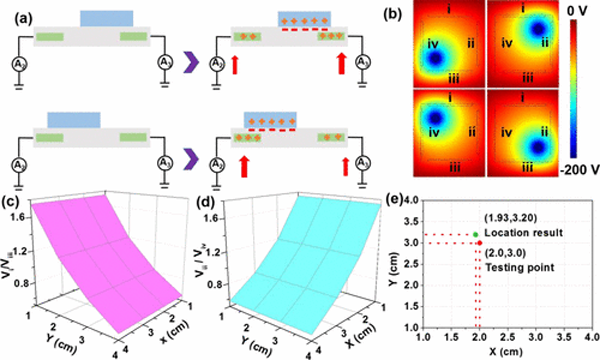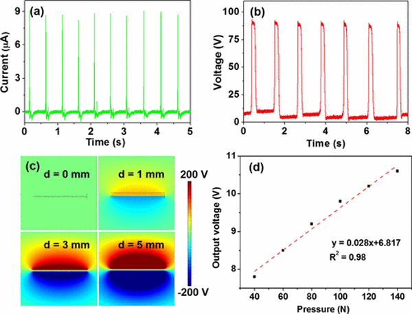 c) 智能触觉传感器的电位差和带隙距离的数值模拟;