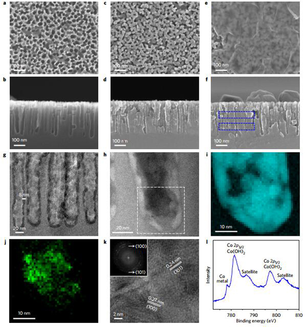 本文作者合成了稳定的黑硅光阳极,在PEC水分解中表现了良好的电荷分离能力。利用ALD技术在p-Si整个通道的表面覆盖一层8nm厚的空穴导电的无针孔TiO2保护层,结合 Co(OH)2 OER 催化剂优化薄层,这种黑硅光电极表现出了 32.3 mA cm–2 的饱和光电流,显著优于 Si/Co(OH)2 和 b-Si/Co(OH)2 。这项成果表明, ALD TiO2 可以同时提升黑硅电化学系统的效率和稳定性,给太阳能发电的燃料带来新的希望。