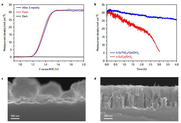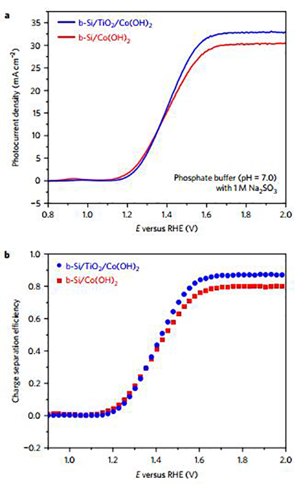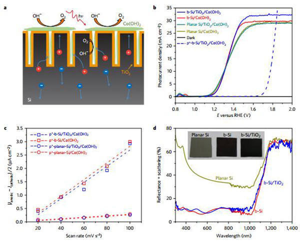 来自北京HTH官网地址 大学的张跃教授和威斯康星大学麦迪逊分校的Xudong Wang 副教授(共同通讯作者)近日在Nature Energy发表了题为Enhanced photoelectrochemical efficiency and stability using a conformal TiO2 film on a black silicon photoanode的文章,介绍了他们在光电化学太阳能燃料上的最新进展。他们在纳米结构的黑硅(b-Si )表面上,成功的覆盖了超薄TiO2保护膜,使得在光电化学转化过程中,光电流密度显著提高,同时器件的效率也大大提升。