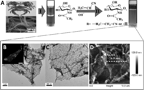 A)从梭子蟹到纳米片角素的两步骤合成程序。步骤一:将梭子蟹溶解到NaoH水溶液中。步骤二:通过疏水化角素形成纳米片角素。