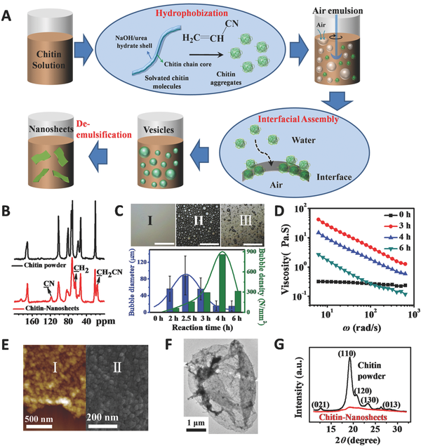 A)纳米片角素诱导界面集结的示意图,角素致使空气乳化和甲壳素分子的聚集,甲壳素在界面上的聚集产生空心甲壳素囊泡,经过搅拌破乳产生纳米片角素。