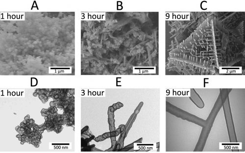 (C)(F)反应9h后,中空小球完全转化为纳米管并且形成了纳米管网络