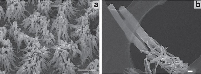 a. SEM成像金的多级纳米结构(纳米孔Al2O3为模板,压力5kN,温度500℃,热压时间~10min),标尺 1.5μm;