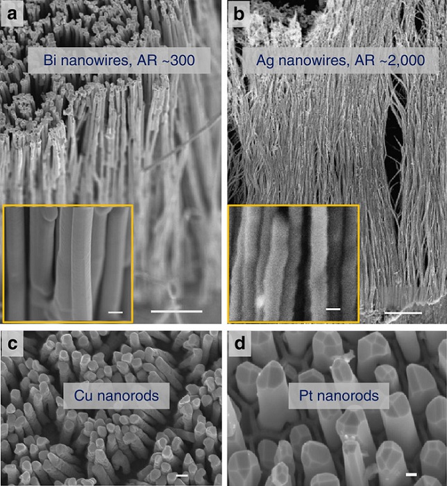 c和d. SPNI技术制备的Cu(~550℃)、Pt(~820℃)金属纳米线阵列,标尺200nm和100nm。