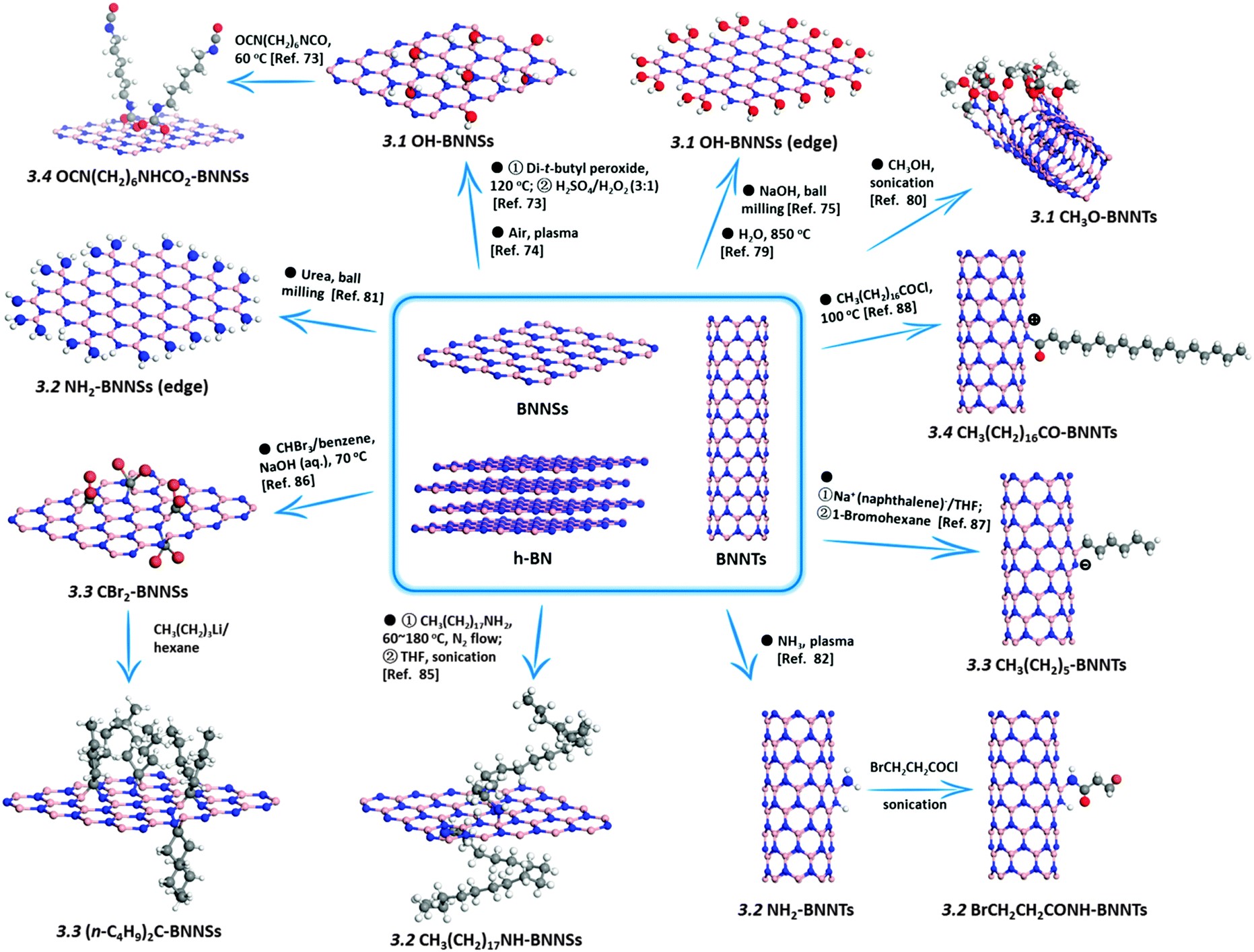 由于六方氮化硼的结构与石墨类似,因此利用化学方法对其进行修饰得到了很多的研究并且获得了长足的进步。羟基(-OH),氨基(-NH2),乙醚(-OR),胺(-NHR),卤素基团(-X)以及异质原子都被尝试连接在了六方氮化硼的骨架上,如图二所示。
