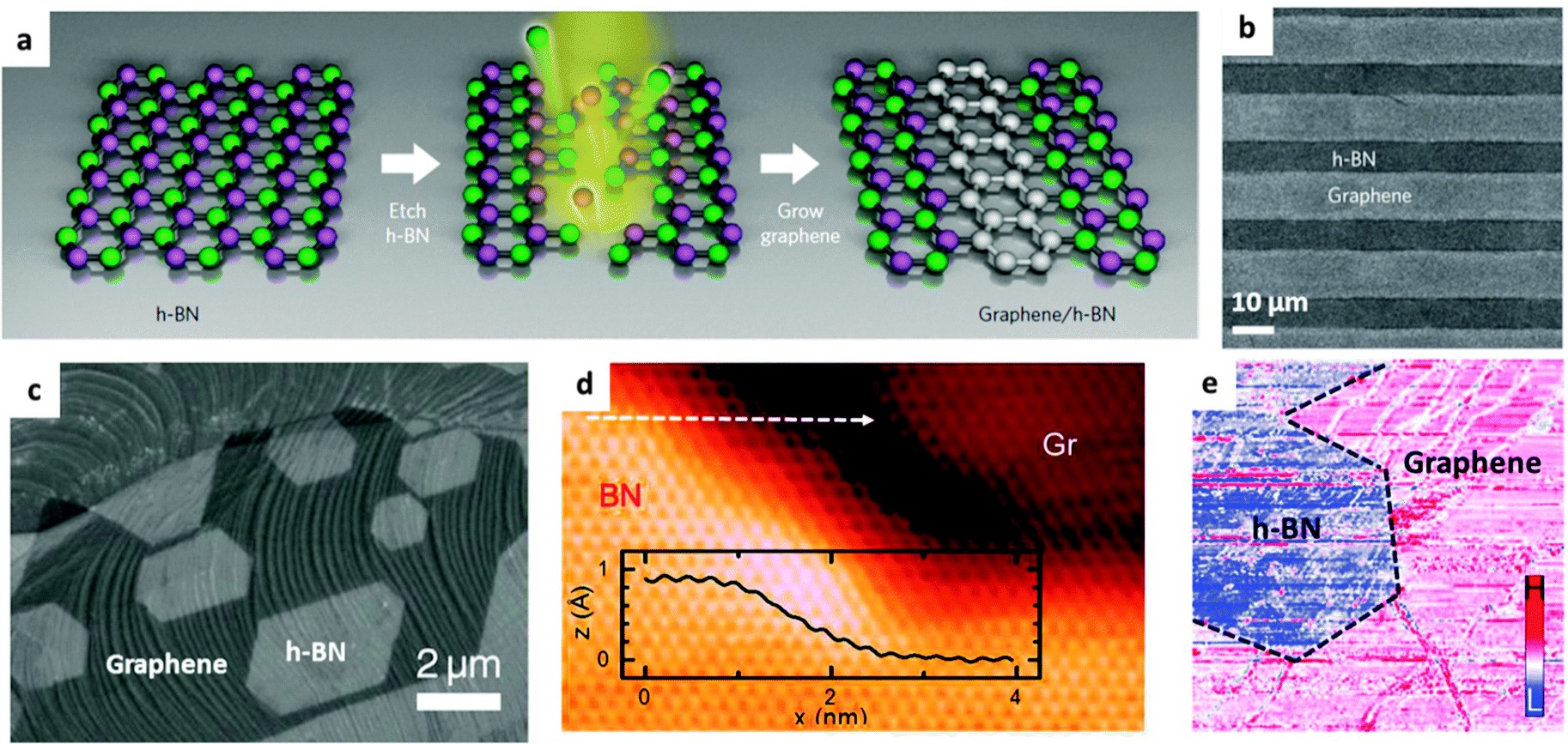 二维材料在微电子学中的应用引起了人们广泛的兴趣,因此通过将六方氮化硼与其他二维材料进行复合以结合两种材料的优点和特性,也是现在研究的热点之一。将BN和石墨进行单原子层的复合,从而利用BN的绝缘性能和石墨的导电能力,吸引了工业界和科学界的广泛注意。通过CVD或者外延生长的方法,都可以实现异质结的形成。