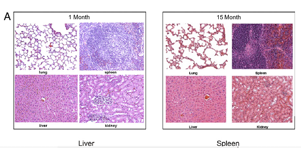 A)小鼠的肝脏,脾脏,肾脏和肺的组织病理学图像在 注射单剂量的AuNRs 之后的不同时间点