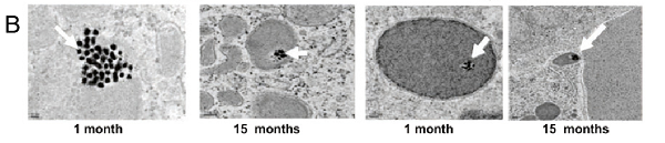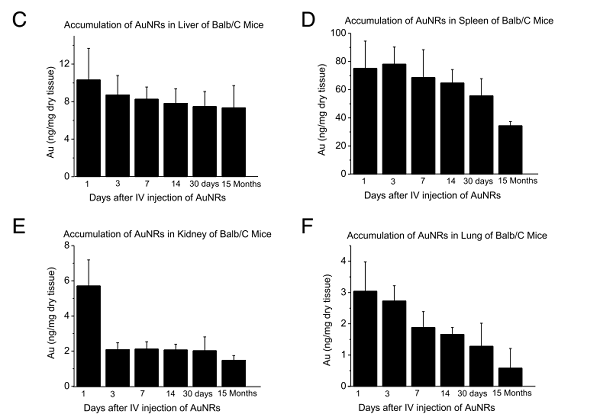 C-F)注射单剂量的Au NRs15个月内不同器官中的Au NRs积累,肝脏(C),脾脏(D),肾脏(E)和肺(F)分别显示在不同时间点的小鼠的Au浓度