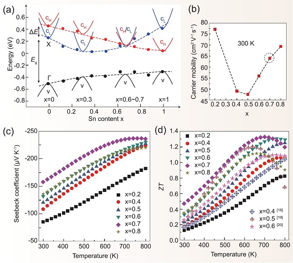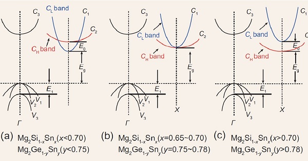 根据先前的文献报道,二元Mg2IV化合物拥有非常相似的能带结构特性:导带边是由具有能带偏移为E0的重导带(CH)和轻导带(CL)组成。在Mg2Si和Mg2Ge中,处于偏下位置的CL带主要由具有s-轨道的Mg 3p杂化轨道和Si/Ge的d-eg轨道形成。相比之下,Mg2Sn中偏下位置的CH带主要由杂化的Mg的3p轨道和Sn的d-t2g轨道形成。因此,可以选择Mg2IV固溶体合适的组成实现重导带(CH)和轻导带(CL)的有效重叠。