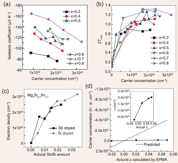 根据经典的输运理论,电导率的增加必然导致塞贝克系数的减小。考虑到由于更大的电子热导率会使物质整体的热导率增加,因此优化热电品质因数需要考虑最佳的载流子浓度。结果表明,依赖具有特定热电性能的材料,其有效的热电转化载流子浓度范围是1019-1021cm-3。大量的研究证明,n型Mg2Si1–xSnx固溶体的输运性质表现为当载流子浓度从1018cm-3增加到1020cm-3时,其电导率会增加两个数量级,同时塞贝克系数只会适当减小,而PF会增大10倍以上。