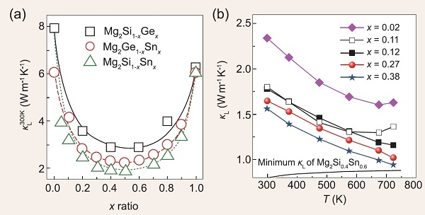 要想使热电材料的ZT值达到较高的数值,降低晶格热导率κL和增强PF同样重要。在Mg2IV基固溶体中,通常使用两种方法减小晶格热导率κL:调控固溶体的组成和控制其微结构。