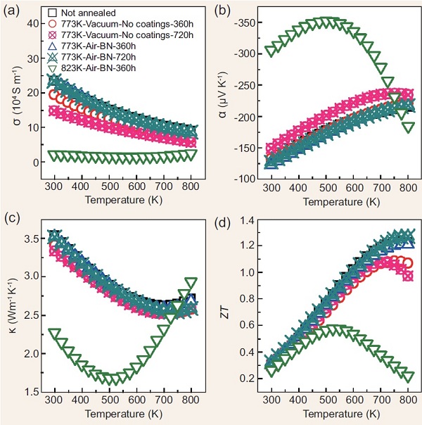 热电器件的开发要求材料具有优异的机械性能和良好的热稳定性。高韧性的SiC和CaSO4的复合显著提高了Mg2Si基材料的机械性能。少量(0.8 at%)SiC纳米颗粒和纳米线的复合可使Mg2Si0.3Sn0.7固溶体的断裂韧性提高约50%,同时由于SiC具有极高的强度,材料的压缩强度也提高了近30%,接近于力学性能优异的MnSi1.70+d材料的水平。BN涂层保护的Mg2Si0.3Sn0.7固溶体表现出良好的热稳定性,在热电器件使用温度773K下空气中退火720h后材料的热电性能没有衰减,这充分说明了BN涂层对Mg2Si0.3Sn0.7固溶体的有效保护。
