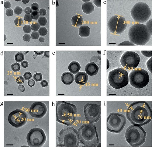 (g-i) 二次刻蚀(DSHM)分别在刻蚀浓度低、中、高下的空腔大小和壳壁厚度。