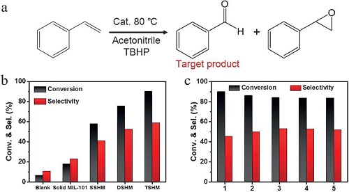 (b)苯乙烯的氧化由不同刻蚀程度的中空MOFs催化的转化率和选择性;