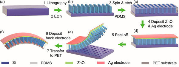 图1.柔性聚合物/Si/ZnO LEDs阵列器件的制备过程