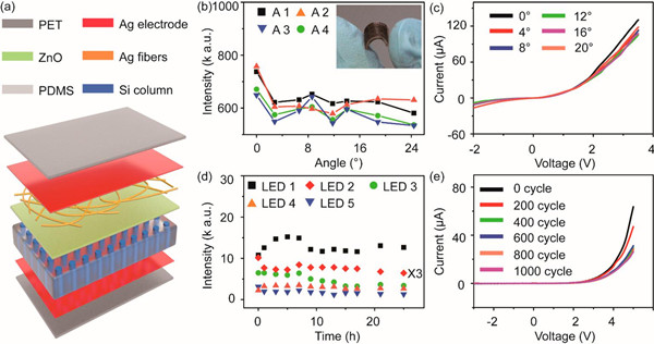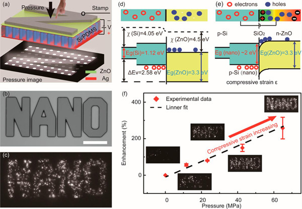 来自清华大学材料学院的朱静院士、中科院北京纳米能源与系统研究所的王中林院士、潘曹峰研究员(共同通讯作者)等人研制出了集柔性、稳定、质量轻和可进行能量收集等优点为一身的Si微米线-ZnO纳米薄膜基的柔性LED阵列器件,该器件可以用作测二维压力分布的作压力传感器。基于压电效应,柔性LED阵列亮度可以提高三倍(在低于60Mpa的压力下)。此外,该器件性能稳定并可进行能量收集实现自供电,在1000次弯曲循环和在空气中放置6个月之后依然可以很好地工作。且该柔性LED阵列器件的功耗仅是平常LED功耗的8%。这种柔性硅基器件具有广阔的应用并且有可能引发柔性显示屏、触屏技术和智能皮肤相关的技术革命。