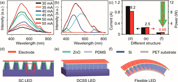 (c-f)比较三种不同但相似的ZnO/Si LED阵列器件的不同点:(d)SC LED,(e)DCSS,(f)柔性LED