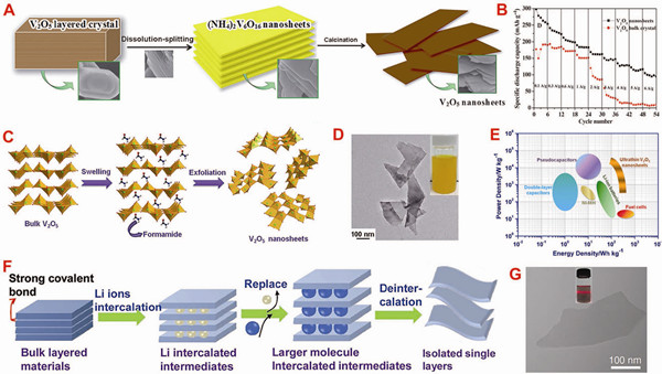 钒氧化物可以通过“自下而上”和“自上而下”的方法得到,但可控的合成依然是一大挑战,而且目前大部分利用钒氧化物做电极材料的锂离子电池的比电容仍然低于200 mA h g-1.