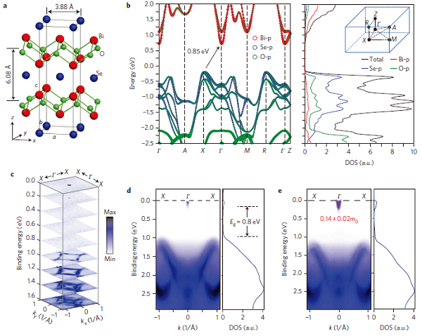 (e). 利用表面K-dosing提高化学位后,进行测试所得的导带的能带色散关系和态密度图,测试分析显示Bi2O2Se晶体具有较低的有效质量,仅为0.14±0.02m0。