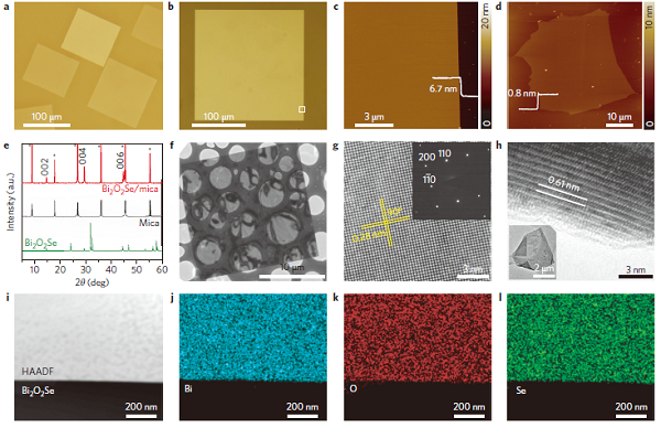 (i-l). Bi2O2Se纳米片的高角环形暗场(HAADF)图像及对应的元素分布图。