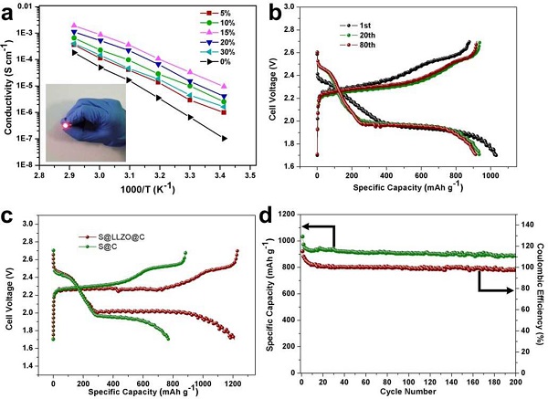本文作者通过简便的一步Pechini溶胶-凝胶法,已经成功地制备了Al3+/Nb5+ 掺杂的立方LLZO和LLZO@C纳米结构,经过优化后,在20和40℃下,具有15wt%LLZO的PEO-LiClO 4聚合物电解质分别显示9.5×10-6和1.1×10-4 S cm-1的高电导率。使用LLZO @ C纳米结构作为基体加载S,固态Li-S电池在人体温度37℃下展示出超过900mAh g-1的比容量。这些固态电极和电解质的合理设计策略将为下一代储能开辟新途径。