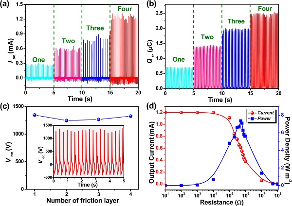 不同层数ML-TENG的(a)Isc,(b)Qtr和(c)Voc,(c)图中插图为层数为4的ML-TENG的Voc,(d)层数为4的ML-TENG在有外部负载下的输出电流和功率。