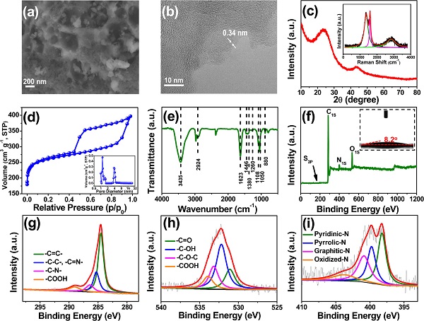 (a)SEM,(b) TEM,(c) XRD和Raman光谱,(d)氮气等温吸附/脱附曲线和孔径分布,(e)傅立叶红外光谱(FTIR),(f) 全扫描X射线光电子谱和水接触角;碳基材料-1的C 1s (g), O 1s (h), 和N 1s (i)高分辨XPS谱。