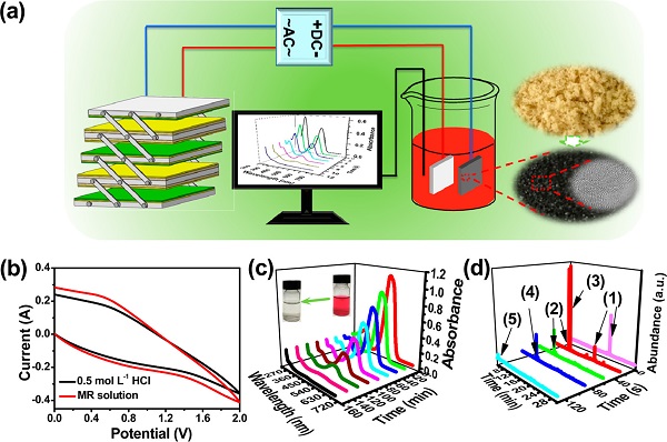 (a)ML-TENG供能的MR降解原理图,(b)0.5 mol L-1的盐酸和MR(10 mg L-1 )的混合溶液的CV图,扫速为100 mV s-1,(c)MR降解过程的紫外-可见吸收光谱,(d)MR降解中间产物的GC-MS谱。