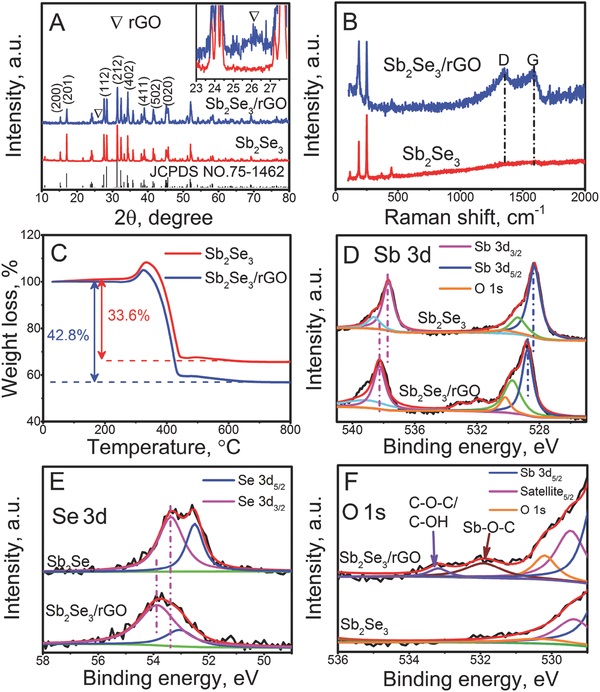 图2. Sb2Se3和Sb2Se3/rGO的形貌结构表征图