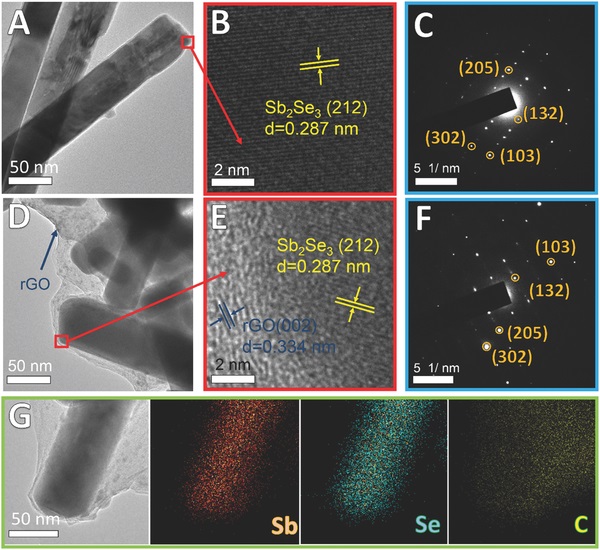 (A-C)分别是纯相Sb2Se3的TEM、HRTEM和SAED图,(D-G)分别是Sb2Se3/rGO复合物的TEM、HRTEM、SAED和EDX mappings图。
