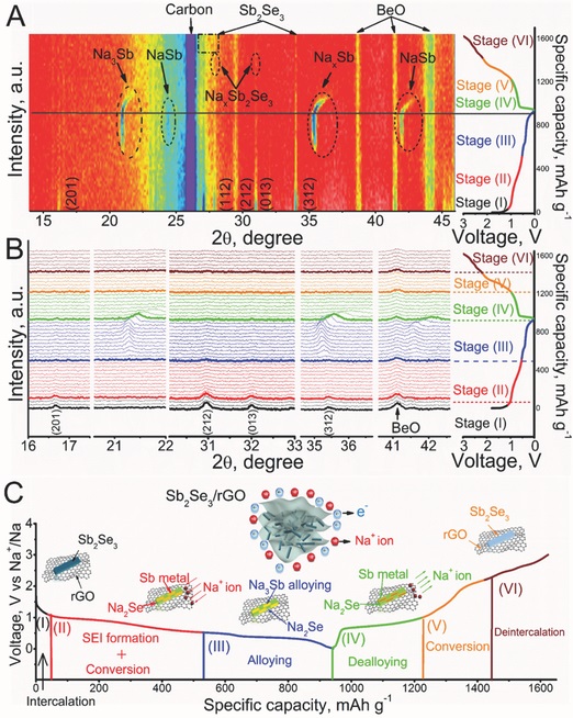 (A)Sb2Se3/rGO电极首次充放电过程中的原位XRD衍射二维轮廓图。