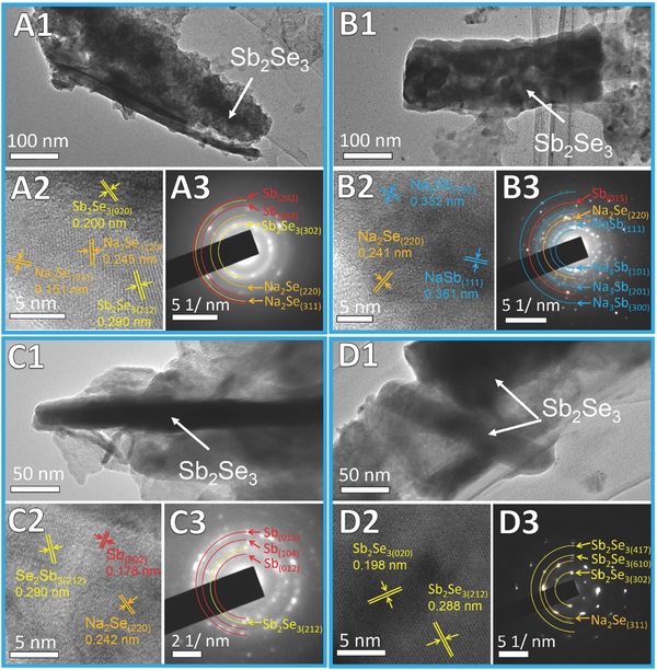 图5. Sb2Se3/rGO电极在首次充放电过程中不同截止电压下的微观结构图