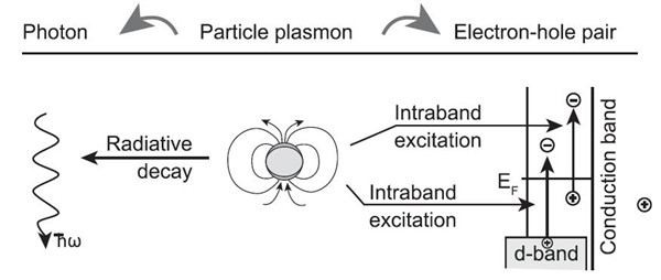 图1 贵金属纳米颗粒中颗粒等离子体基元的辐射(左)和非辐射(右)衰减