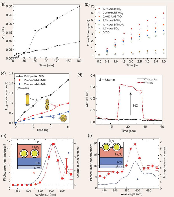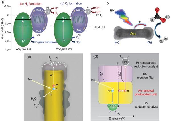 由于人类正在面临着来自于环境污染和能源危机的挑战,因此在清洁和可再生能源领域的革命已经发生。在所有新能源中,氢气由于其高能量容量和环境友好性而成为其中最吸引人的燃料。自从Fujishima和Honda利用TiO2进行光电化学分解水以来,由于其对于解决环境和能源问题具有极大的潜力,因此吸引了很多关注。通过沉积等离子金属纳米颗粒,诸如TiO2的半导体已经被证明在光催化和光电催化分解水中对可见光有响应。Au/TiO2可以在λ>400 nm或单色光波长为532nm时光催化产氢和氧。这都归因于电子从Au纳米颗粒到TiO2的转移。另外一个在分解水中利用金属吸收的重要部分就是光催化增强,尤其是在光电化学的研究中。