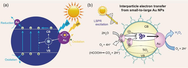在过去的十年间,探索金属在光催化剂中的影响的研究已经形成了一股浪潮,同时人们也将更多的关注转移到致力于应用金属纳米颗粒(NPs)的光吸收特性上来,而不是将其作为助催化剂的传统应用领域。光的吸收是金属纳米颗粒的特性之一,尤其是作为铸币金属这些肉眼可见的纳米颗粒。这些特性已经应用在了医药治疗、表面增强拉曼光谱等领域。Kozuka等人是金属诱导光催化剂(MIP)研究领域的先驱,其引入了Au和Ag评价TiO2层的光电化学性能。研究者们在这一领域已经取得了巨大的进步,同时,MIP也已经成为了发展高效可见光响应复合材料的重要思路。纳米颗粒中光的消亡过程包括散射和吸收。大颗粒对于光的散射十分有效,而小颗粒的颜色主要由吸收引起。一般来说,和MIP过程相关主要有两种激发模型:定域表面等离子体共振(LSPR)和带间跃迁。LSPR主要是指当颗粒尺寸远小于入射光波长时,光会与颗粒发生作用,从而导致在纳米颗粒附近有以一定频率的等离子体的定域共振。尽管一些可替代的等离子体材料(例如超材料)已经被开发出来,但金属的等离子体特性仍然是等离子光催化剂的主要研究对象。