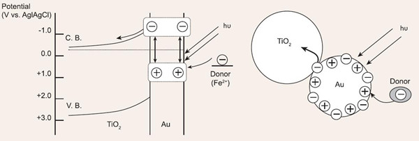 等离子纳米颗粒中热电子的寿命通常小于10-3ns。对于没有电子施主的Au/TiO2复合材料来说,注入到TiO2中的热电子会在大约1.5ns后衰减返回Au等离子纳米颗粒,并和热空穴结合。因此,促进电荷分离应该是增强MSC材料效率的一个有效的手段。此外,表面设计也是增强MSC系统效率的另一个思路。电荷载流子的分离同步可以通过点击化学的方法裁剪Si–Au–TiO2异质结构的界面来实现。处于Si和SiO2之间的Au形成的三明治结构可以吸收可见光并将热电子转移到临近的半导体中,这可以有效促进光转化效率。
