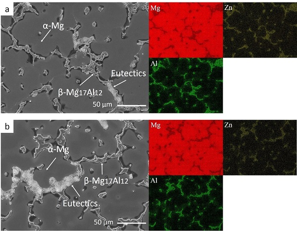 图(a)和图(b)分别为AZX910Be60 和AZX911Be60 镁合金的场发射扫描电子显微图像(FESEM)和相对应的元素面扫能谱图(EDS)。从中可以看到,含60 ppm (wt) Be的这两种合金都没有显著改变原有铸态组织的形态。另外,在EDS的测量精度范围内,由于Be含量较少,在铸态合金中没检测到Be。
