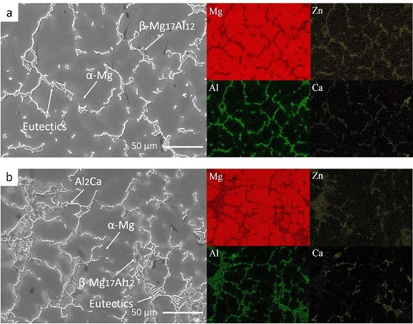图(a)和图(b)分别为AZX910和AZX911镁合金的场发射扫描电子显微图像(FESEM)和相对应的元素面扫能谱图(EDS)。从中可以看到,在这两种合金中,层状分布的Mg-Al共晶组织明显减少。当Ca含量达到1.0%质量比重时,在AZX911合金中的β-Mg17Al12 金属间化合物所占体积分数显著降低。另外,存在项链状的Al2Ca 金属间化合物和层状的Mg-Al2Ca共晶组织沿枝晶边界分布。