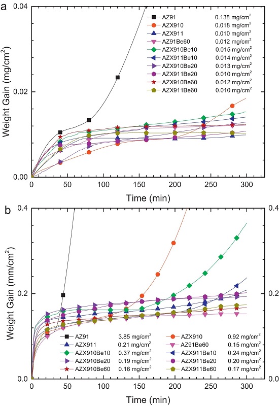 (a)和图(b)分别为含有各种Ca和Be元素含量的系列铸态AZ91 镁合金分别在400℃和450℃下的热重数据。从中可以看到,随着时间的延长,合金的总质量是不断增加的,表明发生了氧化。并且加入有Ca和Be元素的合金在这两种实验温度下都可以不同程度的降低增重速率,说明可降低氧化速率降低,既起到一定的抗氧化作用。含20ppm(wt)Be和0.5wt%Ca的协同效应与含60ppm(wt)Be的效果相似。