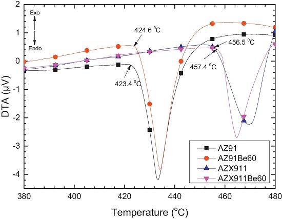 该图为AZ91, AZ91Be60, AZX911和AZX911Be60 四种镁合金在加热速率为10 K/min时的差热分析(DTA)曲线. 从中可以看到,当AZ91镁合金中加入1.0 wt.% 的Ca后,其熔点提高30℃。相比之下,Be的加入对AZ91Be60, AZX911Be60 两种含Be合金的DTA曲线的影响都很小。