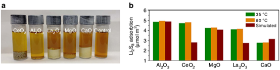 图2(a)是不同的样品质量在相同的金属氧化物表面积上的吸附效果展示。对比这几种颜色的深浅,可以看出装有Al2O3和CeO2的样品,颜色更浅,说明这两种物质有较大的吸附容量,图(b)是比较同一类金属氧化物随温度升高,对Li2Sx的吸附效果,比较较好的金属氧化物Al2O3,可以看出实际效果同理论模拟较吻合,并且温度影响不大。对比所有材料都能得出一定温度区间对吸附容量影响不大。