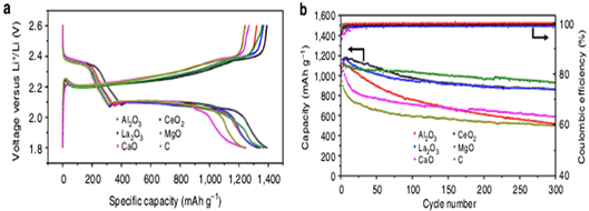基于金属氧化物的复合阴极材料,展示出高比容量,高循环稳定性,通过该工作团队的研究,为其他基体材料(金属氮化物,金属氯化物,金属硫化物)应用到锂硫电池,提高它的性能,产生新的选择标准。