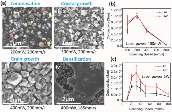 (a)氩气保护下,在Na-CMC上四种不同的打印、烧结方式的扫描电镜图:i 沉积、ii 晶体生长、iii 颗粒生长、iv 致密化;