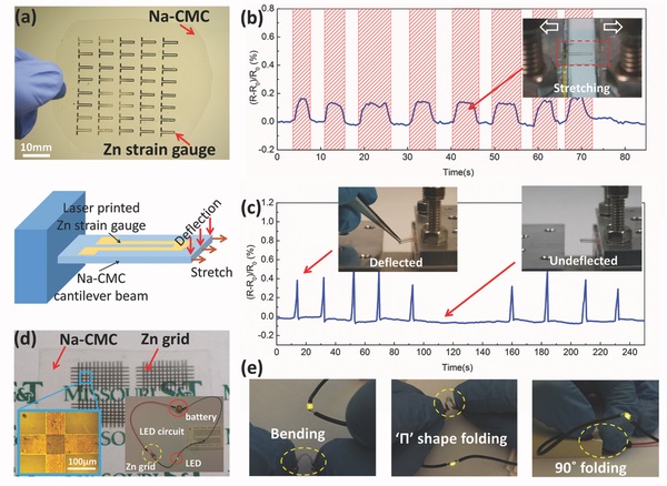 (a)在Na-CMC基质上激光打印的具有电阻的Zn应变仪,在遭受拉伸或折叠时测量其应力变化;